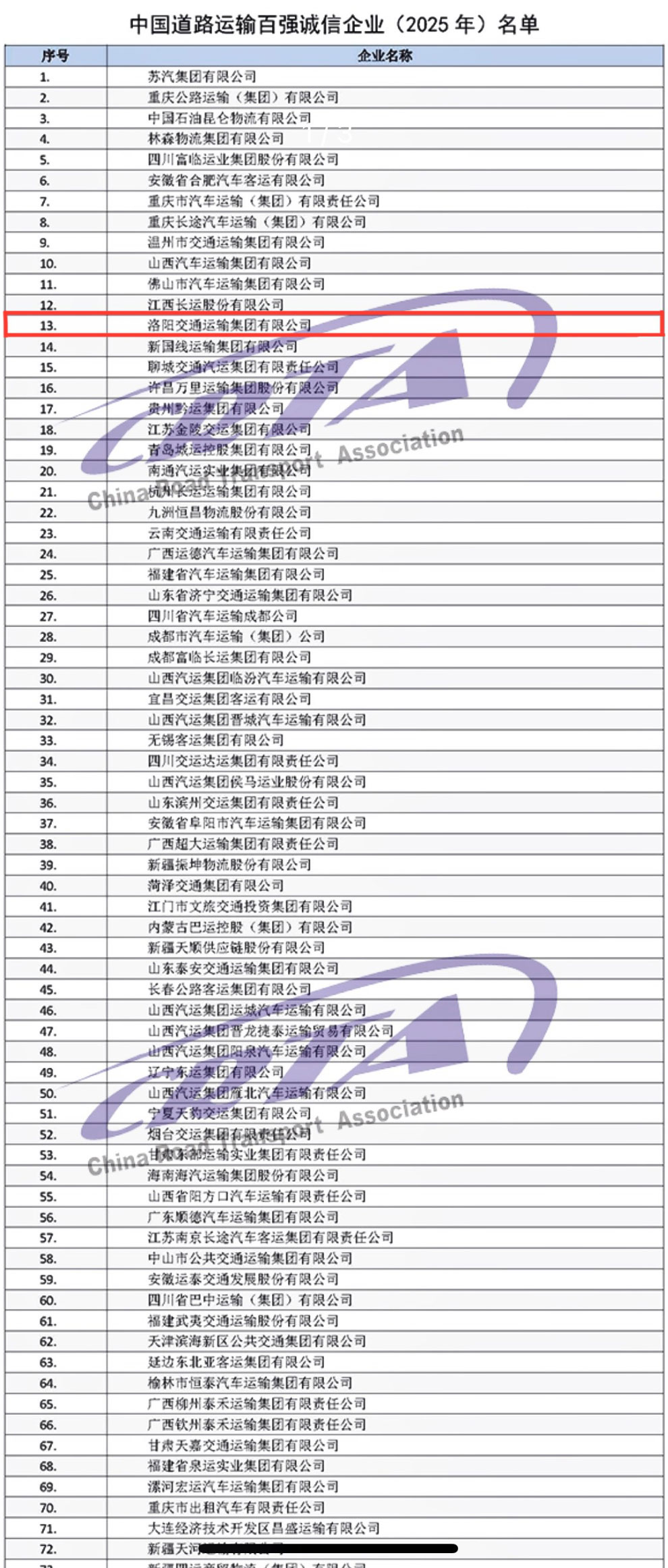 近日,中國道路運輸協(xié)會發(fā)布“中國道路運輸百強誠信企業(yè)(2025年)”榜單,洛陽交通運輸集團有限公司憑借卓越的經(jīng)營實力、誠信的服務(wù)理念和持續(xù)的改革創(chuàng)新,榮登榜單第十三位。